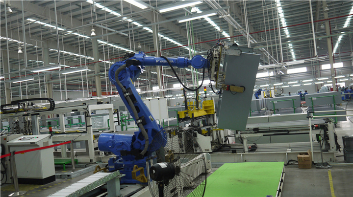 3、壓縮機(jī)自動化組裝。冰箱發(fā)泡后豎身45度、由機(jī)械手固定安裝壓縮機(jī)的工裝設(shè)備,目前已投入實際應(yīng)用。機(jī)器人識別、搬取、固定壓縮機(jī)的裝備技術(shù),改變了原先操作工身兼搬運(yùn)工、甚至焊接工的情況,明顯降低了現(xiàn)場工人的勞動強(qiáng)度,成為冰箱生產(chǎn)自動化的重要環(huán)節(jié)之一。