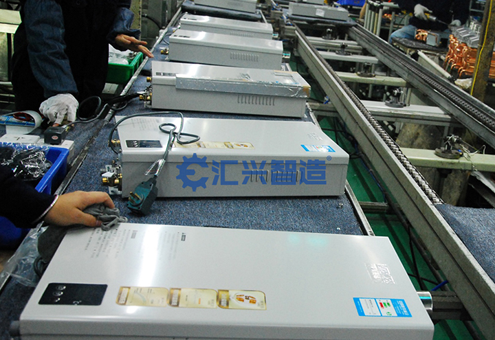 熱水器組裝線主要由鏈板輸送線組成,鏈板輸送機的輸送面平坦光滑,摩擦力小,可以安全且游刃有余地輸送熱水器配件并進行組裝。