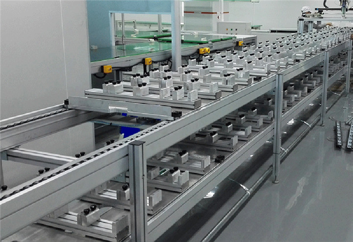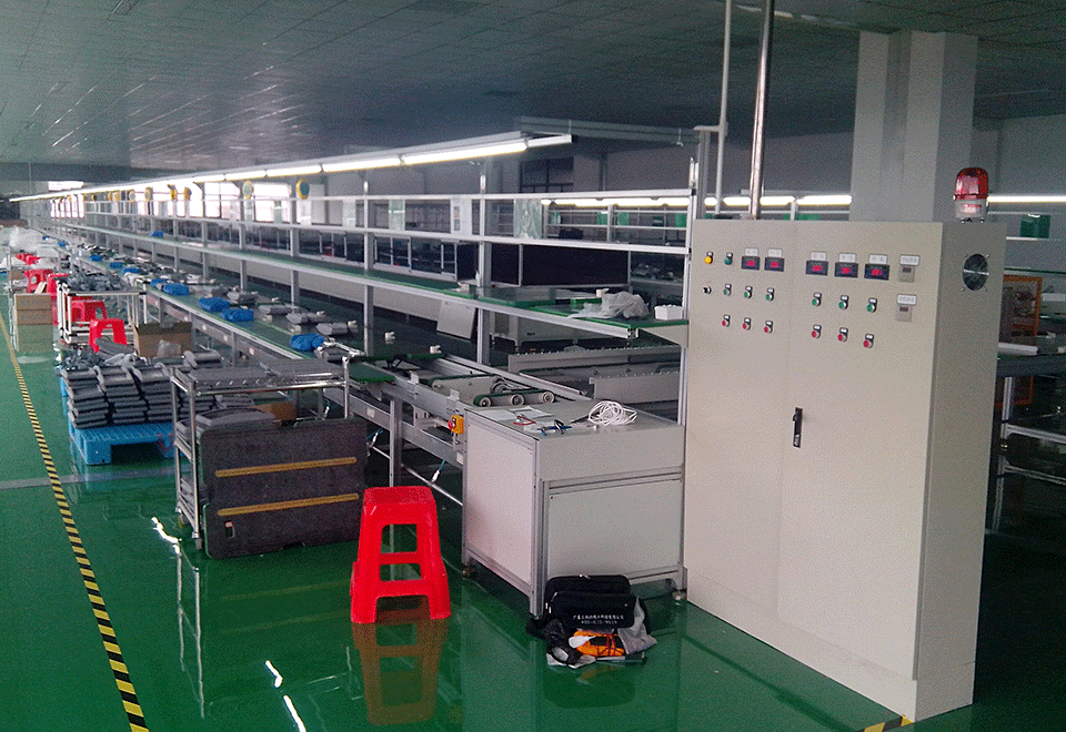 來料測試線機架腳架采用優(yōu)質(zhì)方通組焊制作,每2米一段,采用鍍鋅可調(diào)腳杯;線體皮帶護(hù)邊采用方管制作,沿線體兩側(cè)一路布置;承載采用鍍鋅滾筒,中心間距200㎜安裝一條,全線布置;輸送帶采用綠色PVC防靜電皮帶,厚2mm、寬500mm無縫熱縮接駁,皮帶面低于機身護(hù)邊8㎜;照明系統(tǒng):采用優(yōu)質(zhì)方管組焊制作,選用40W單支帶罩T8電子節(jié)能支架,全線布置。工作臺: 配對面坐工作臺,優(yōu)質(zhì)木夾板制作,面貼綠色防靜電膠皮,半圓木條包邊。