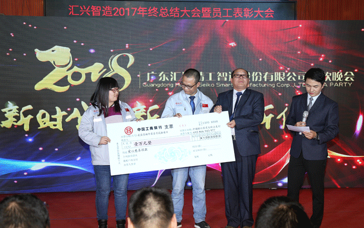 2017年,匯興智造設(shè)立了愛心慈善基金會,為家庭生活異常困難的員工及其家屬奉獻愛心。在晚會現(xiàn)場,家庭遇到極大困難的五名員工接受了愛心捐贈。只要人人都獻出一點愛,世界將變成美好的人間。在場的所有人無不被這一善舉感動拭淚。