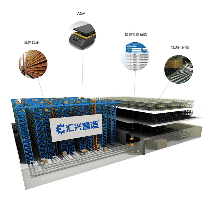 立體倉庫區域、AGV輸送、WMS信息管理系統、自動化分揀、入庫輸送分流區、出庫輸送分流區、成品封帶、碼垛區、成品入庫物流線、空托盤回流線等結構組成。