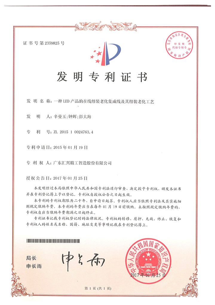 《一種LED產品的在線組裝老化集成線及其組裝老化工藝》發(fā)明專利證書