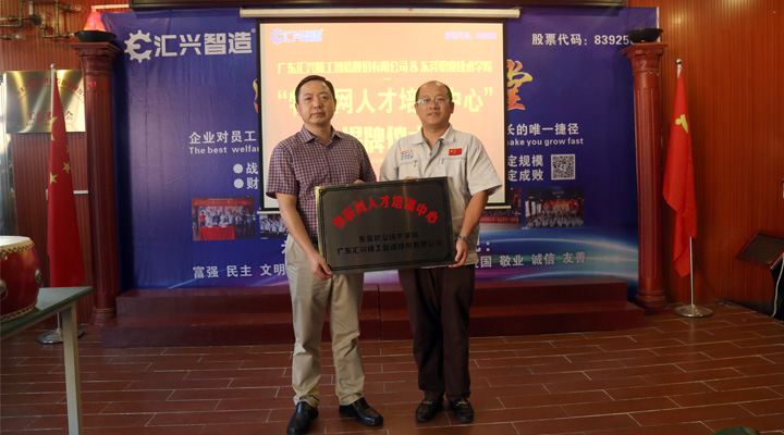 2017年9月27日下午, 東莞職業(yè)技術(shù)學(xué)院副院長(zhǎng)楊云奇,計(jì)算機(jī)工程系主任胡選子博士,藝術(shù)設(shè)計(jì)系主任何鳳梅博士,計(jì)算機(jī)系曹文梁教授等專家人員一行蒞臨廣東匯興精工智造股份有限公司(股票代碼:839258)考察調(diào)研并舉行“物聯(lián)網(wǎng)人才培訓(xùn)中心“基地揭牌儀式。匯興智造董事長(zhǎng)鐘輝,匯興中德智能制造研究院院長(zhǎng)李康順教授熱情接待了調(diào)研組一行。