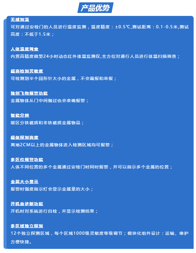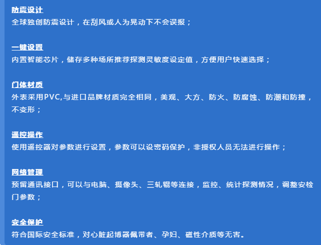 該設(shè)備采用世界先進(jìn)的電磁兼容設(shè)計(jì)和抗震動設(shè)計(jì),具有超高靈敏度、極強(qiáng)的抗干擾能力和抗震能力,適用于管制刀具和槍支等危險物品的安全檢查,廣泛應(yīng)用于監(jiān)獄、法院、學(xué)校、醫(yī)院、電子企業(yè)、港口、客運(yùn)站、展覽會館、會議中心、重大慶典、演唱會等重要場所。