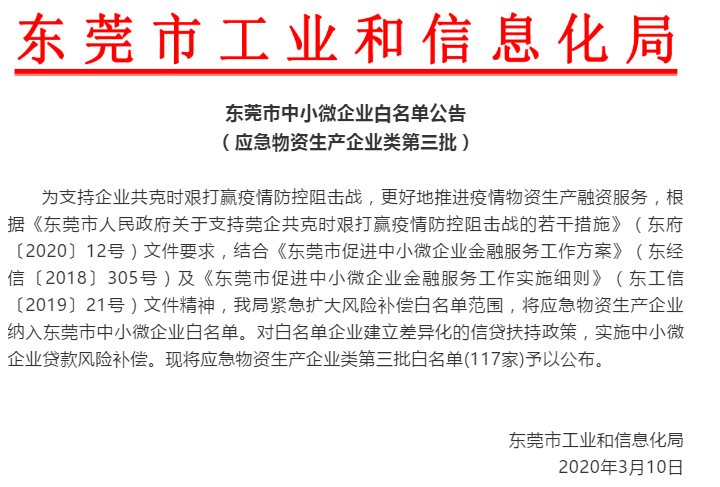疫情防控啟動以來,為進一步用好風險補償專項資金,東莞將應急物資生產企業納入白名單。目前,東莞已將兩批共145家應急物資生產企業納入白名單。