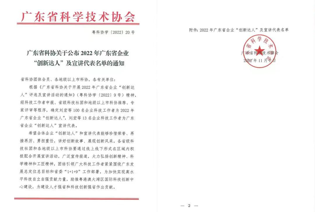 ”講好創(chuàng)新故事 、 展現(xiàn)創(chuàng)新風采“2022年11月15日,由廣東省科學技術協(xié)會開展的2022年廣東省企業(yè)“創(chuàng)新達人”評選活動中,經(jīng)科技工作者申