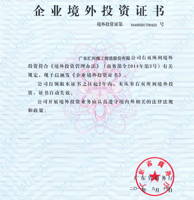2017年8月29日,廣東匯興精工智造股份有限公司(股票代碼:839258)正式獲得企業對外投資證書。匯興智造赴德設立......