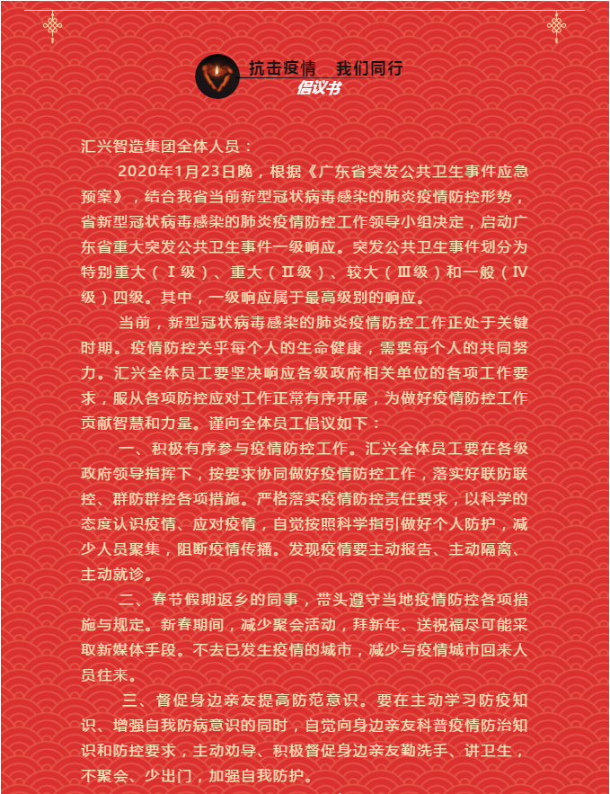 匯興智造集團全體人員: 2020年1月23日晚,根據(jù)《廣東省突發(fā)公共衛(wèi)生事件應急預案》,結合我省當前新型......